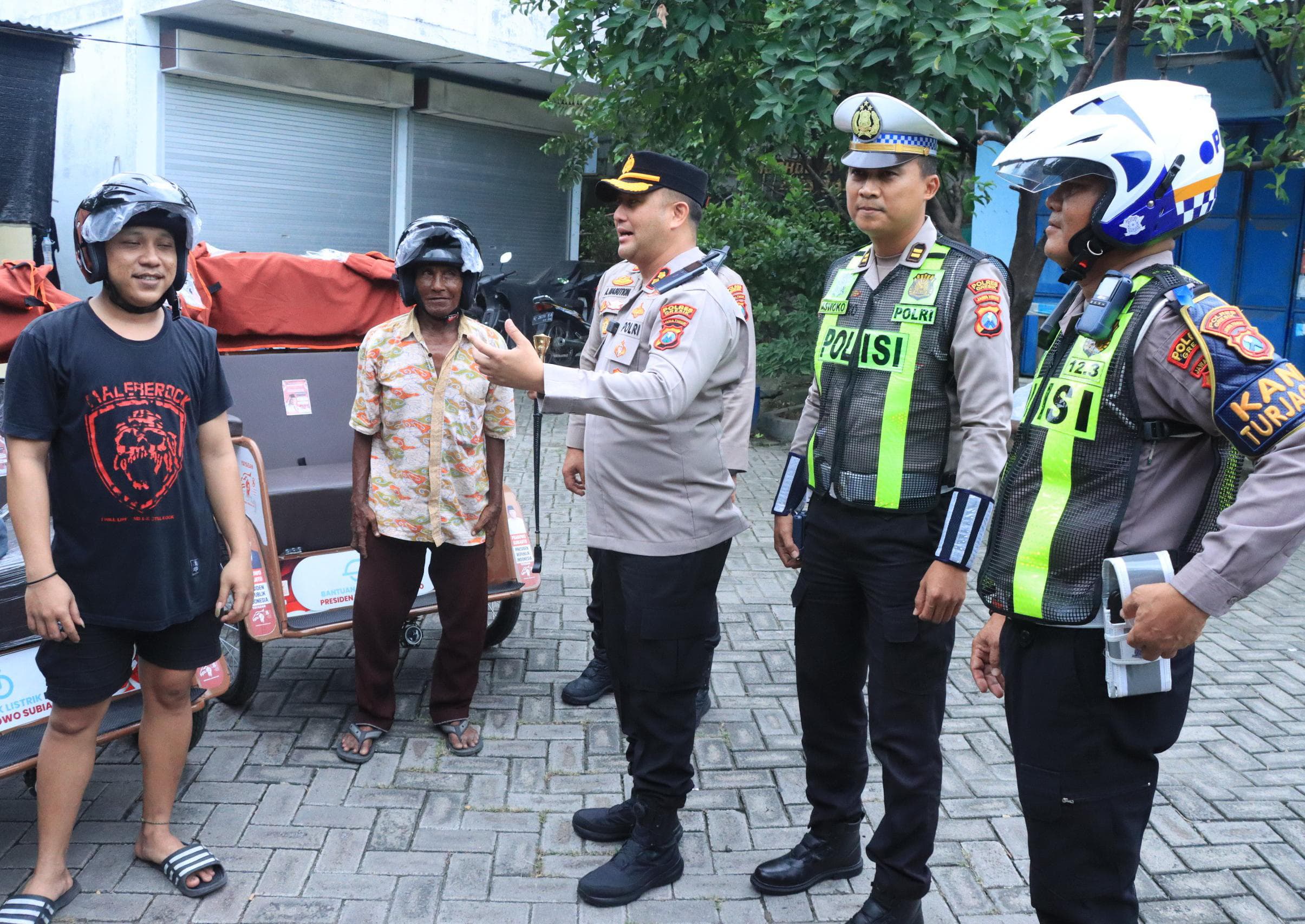 Aksi Humanis Operasi Keselamatan Semeru, Kapolres Gresik Bagikan Helm Gratis Pengemudi Becak Listrik