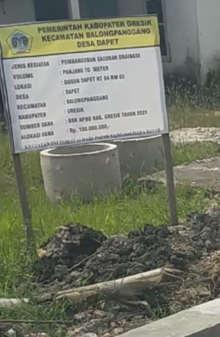 Pekerjaan pembangunan saluran drainase sepanjang 70 meter di Desa Dapet, Kecamatan Balongpanggang, Kabupaten Gresik, memunculkan dugaan serius terkait pembengkakan anggaran. Proyek tersebut dilaporkan menghabiskan dana sebesar Rp 100.000.000. Namun, simulasi perhitungan berbasis Rencana Anggaran Biaya (RAB) sederhana menunjukkan nilai kebutuhan riil hanya sekitar Rp 30 juta.