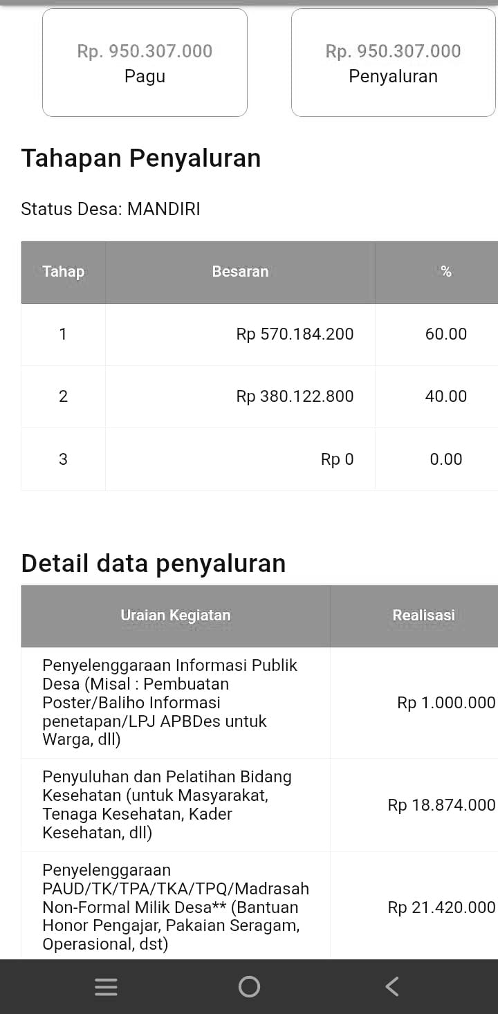 Pencatatan realisasi Dana Desa Wonokerso, Kecamatan Pakisaji, Kabupaten Malang tahun anggaran 2024 memunculkan tanda tanya besar. Berdasarkan data, pagu anggaran sebesar Rp 950.307.000, namun yang tercatat di Online Monitoring Sistem Perbendaharaan dan Anggaran Negara (OMSPAN) hanya Rp 368.895.113 dari total 18 kegiatan.