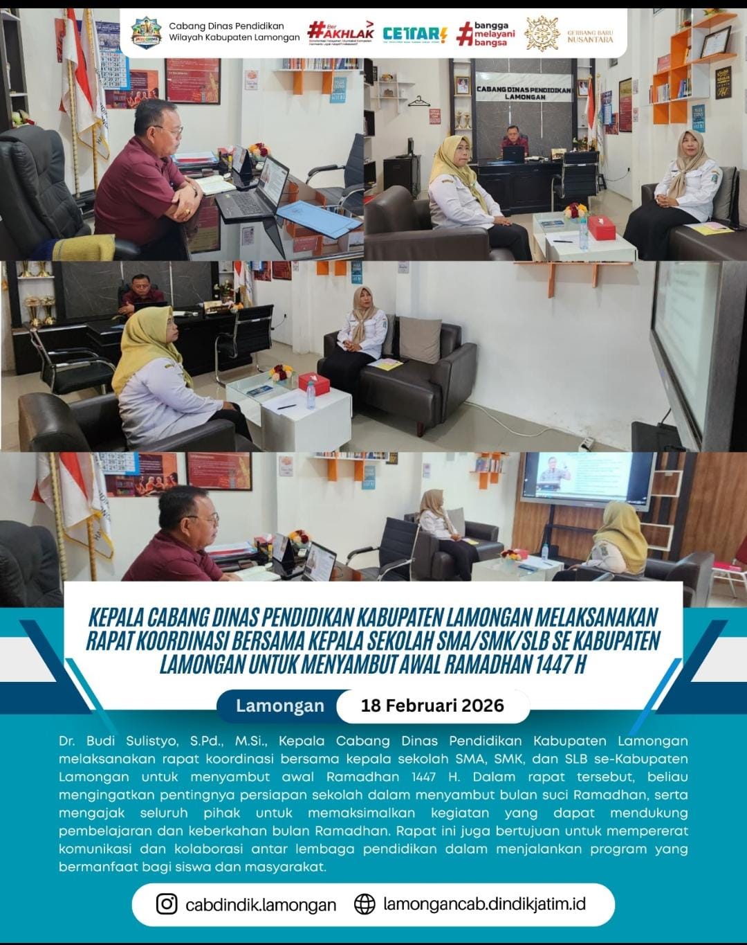 Kepala Cabang Dinas (Kacabdin) Pendidikan Kabupaten Lamongan, Dr Budi Sulistyo, S.Pd., M.SI., melaksanakan rapat koordinasi bersama seluruh Kepala Sekolah SMA, SMK, dan SLB se-Kabupaten Lamongan guna menyambut datangnya bulan suci Ramadan 1447 Hijriyah. Kegiatan yang bertujuan untuk menyelaraskan langkah dan persiapan antar lembaga pendidikan tersebut diadakan di Kantor Cabang Dinas Pendidikan Kabupaten Lamongan.