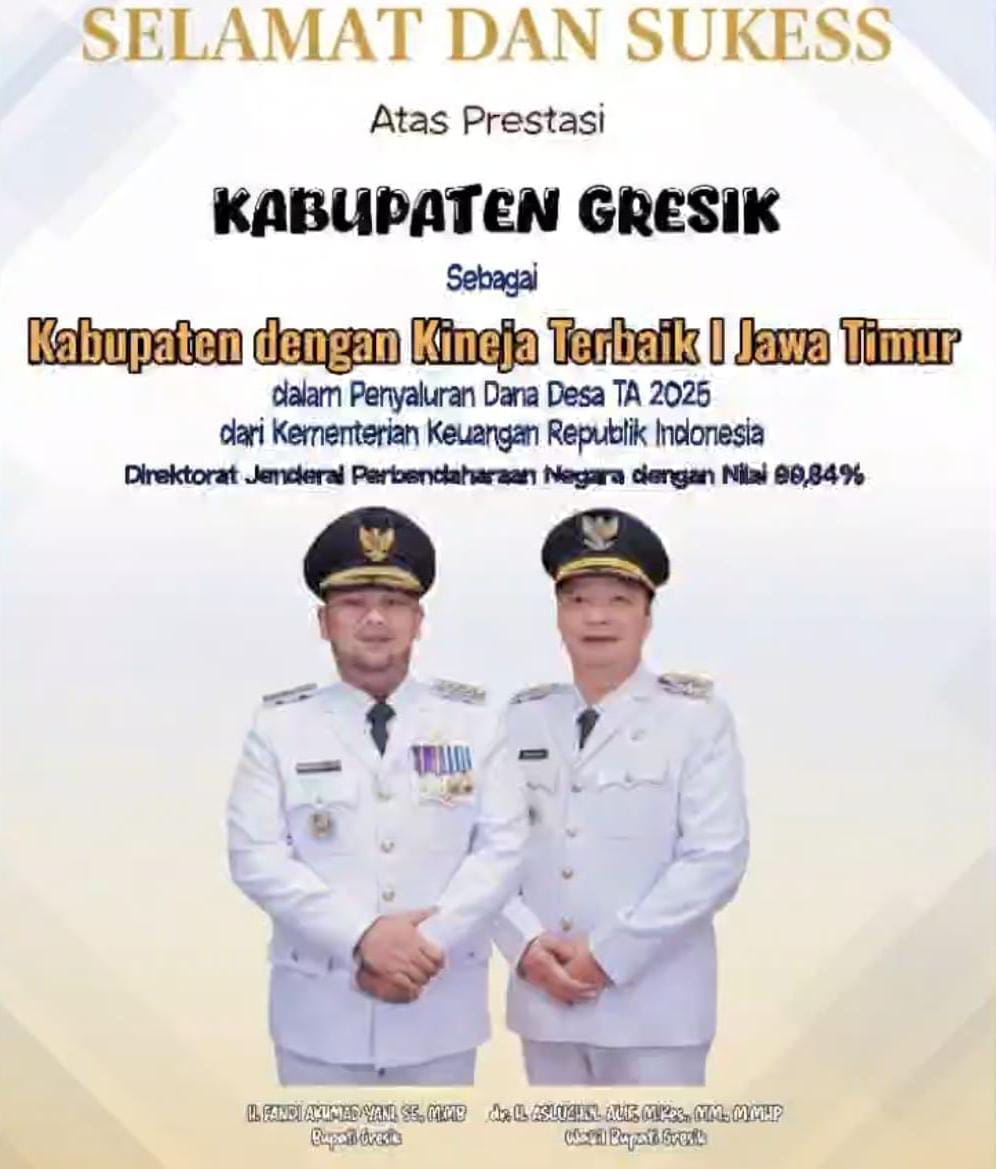 Kepala Dinas Pemberdayaan Masyarakat Desa (PMD) Kabupaten Gresik, Abu Hassan, mengucapkan selamat kepada Pemerintah Kabupaten Gresik atas pencapaian prestasi gemilang. Kabupaten Gresik berhasil dinobatkan sebagai Kabupaten dengan Kinerja Terbaik 1 di Jawa Timur dalam penyaluran Dana Desa Tahun Anggaran (TA) 2025, yang diberikan oleh Kementerian Keuangan Republik Indonesia Direktorat Jenderal Perbendaharaan Negara dengan nilai capaian sebesar 99,84 persen.