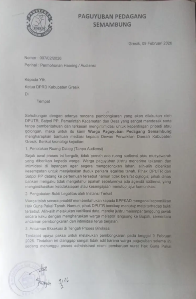 Surat bernomor 007/02/2026 yang ditandatangani pada tanggal yang sama dengan kedatangan mereka memuat permintaan resmi agar DPRD Gresik dapat memfasilitasi proses mediasi antara para pedagang dengan pihak terkait yang akan melaksanakan rencana pengosongan. Para pedagang menilai bahwa rencana pembongkaran yang akan dilakukan oleh Dinas Pekerjaan Umum dan Tata Ruang (DPUTR), Satuan Polisi Pamong Praja (Satpol PP), serta pemerintah kecamatan dan desa telah direncanakan dan akan dilaksanakan secara sepihak, tanpa memperhatikan kepentingan serta kondisi yang dihadapi oleh para pedagang yang terdampak langsung.